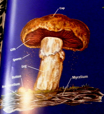 We loved the illustration showing the parts of a mushroom, showing that the Mycelium, or the largest part of the mushroom is underground, which explains the fairy rings.
