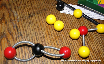Today the boys all played with my molecules set. These have wooden balls of various colors with small holes drilled in them that fit little springs also included in the set. This is much like when we made molecules with marshmallows in that they both follow the same rules.