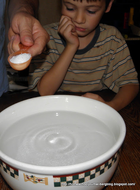 Add 3 tablespoons of Epsom salts to the water and stir to dissolve. (Don't worry if it doesn't all dissolve.) We will be using electrolysis by using the electricity in the battery to break the water molecules down into its constituent elements- hydrogen and oxygen. The salt will help conduct the electricity.