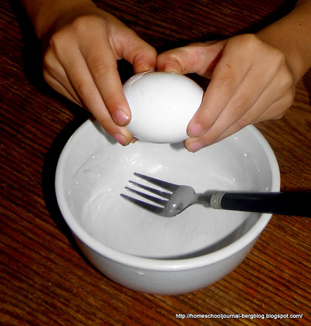 However, if you take an egg (in the shell) and put it in an acid such as toilet bowl cleaner or vinegar, the egg will eventually lose it's shell altogether. If you use vinegar, it will take several days to a week. If you use toilet bowl cleaner, it will take much less time, but cannot be handled without gloves.