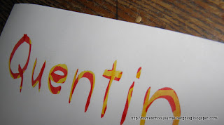 | Then he takes the other end of the marker and traces over the word as carefully as he can. |