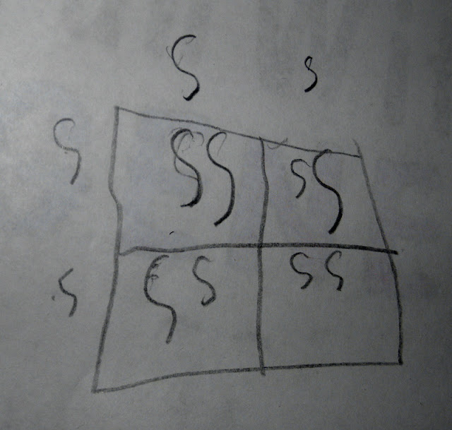 Sam wrote these along the top and side of the square. (Yeah, I know it is hard to tell upper and lowercase with his handwriting, but you are just going to have to trust me on this one.) Then, making the square inside as a four-squared chart, he then put together the combinations by putting together the letters from the side and top of each individual small square, coming up with SS,Ss,Ss and ss.