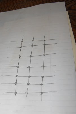 Once we have a few of these index cards made, we can then take them and cover up where they cross with a piece of paper, only leaving the lines sticking out at the top and left hand side. He has to visualize the dot matrix that is now under the paper, internalizing multiplication facts.