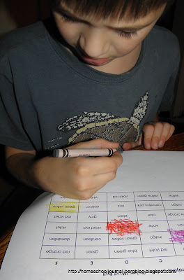 And with their new packs of 24 Crayola colors, the boys played Word Roll game from Relentlessly Fun, Deceptively Educational. In addition to reading a graph, they had to read the color words printed on the graph and match it with the colors printed on the crayons.