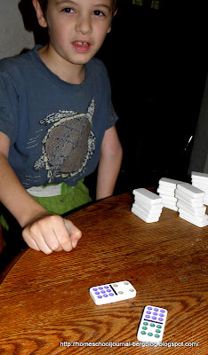 Instead of using flashcards to practice our addition facts, we played War with dominoes. Quentin had to count the two dominoes and determine which one was the larger, or winner. In addition, James had to determined the amount by which the player had won. We played for about two hours straight and had a lot of fun and a lot of math practice.