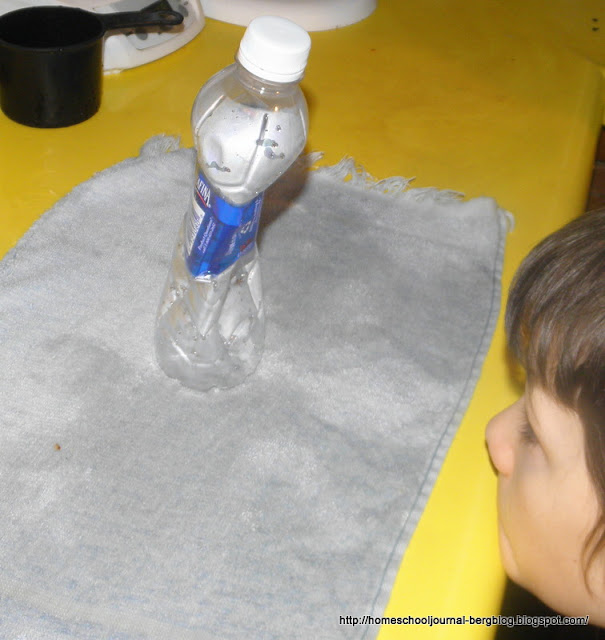 Set it down (in our case, on the towel we used to mop up the water from the previous experiment) and watch it collapse from the pressure of the air outside the bottle.