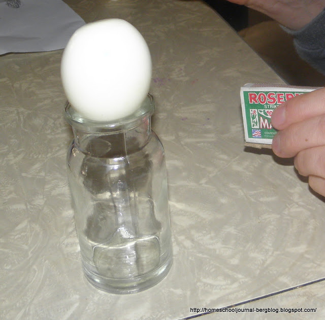 Light two matches and drop them inside the glass jar, quickly place the egg back on top.