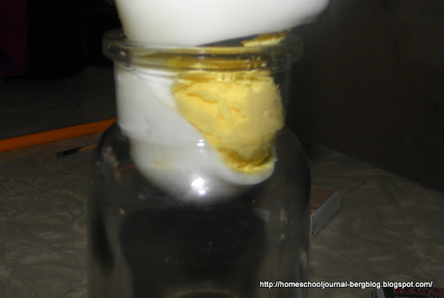 The pressure finally becomes too great for the egg, and it splits open by it. Perhaps our egg didn't plop down into the jar like it was supposed to, but the fact that the egg was torn in two by the pressure was also a dramatic conclusion to the demonstration.