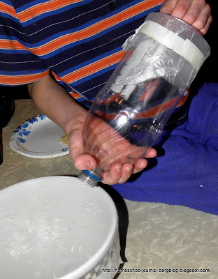 When we were finished with the experiments, James and Quentin had fun using the plastic bottle from the first experiment and, aiming it at the bowl with rice...