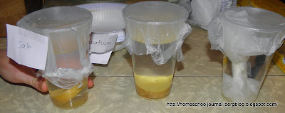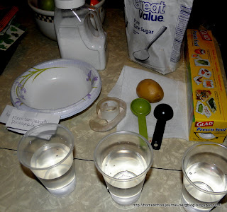 Put a tablespoon of sugar into the center of a unfolded napkin and then fold up the napkin around the sugar and tape it shut so that no sugar and spill out. Put the napkin bundle into one of the cups and fill the cup with water. Cover with plastic wrap and let sit for two hours.