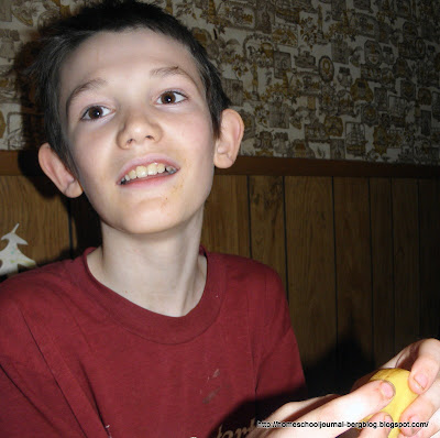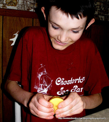 He usually does surprisingly well. (Usually better than James, actually.) This one they enjoyed doing, but they did not fully understand the concepts on the molecular level. These were really for Sam and Alex, and they understood the concepts. They just don't like getting in the pictures. The younger boys like doing them, and love getting in the pictures, so those are the pictures I post.