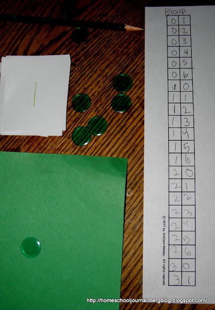 We also use number-flips, which can be as simple as homemade numeral cards made from index cards cut in half. As they count up and down the base they are practicing, they flip over to make the numeral match the amounts on their counting boards.