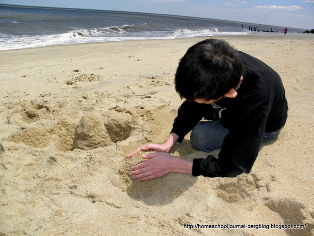 It provided a wonderful opportunity to look at the Horseshoe crab in depth. A Horseshoe Crab has twelve legs; five pairs of walking legs and a set of tiny chelipes. The first four pairs of legs have claws at the tips and grinding joints where they join the body at the mouth. The grinders only work while the legs are moving, so the crab must walk to eat it's food; small mollusks, worms and crustaceans. The fifth pair of clawless legs is use to propel it along the bottom of the ocean or bay.