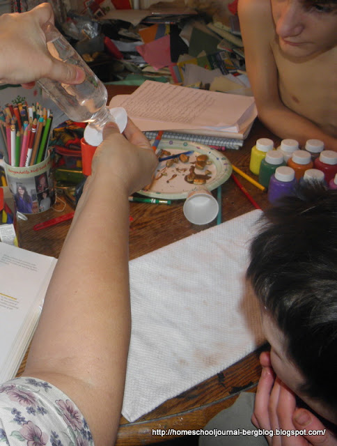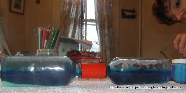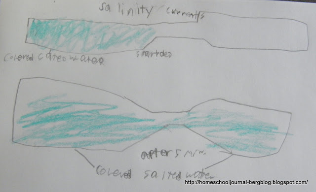 If you like, you can sketch first the set up, labeling which bottle has fresh water and which has salty water, and then using colored pencils, show the movement of the colored water in the bottles and where it ends up.