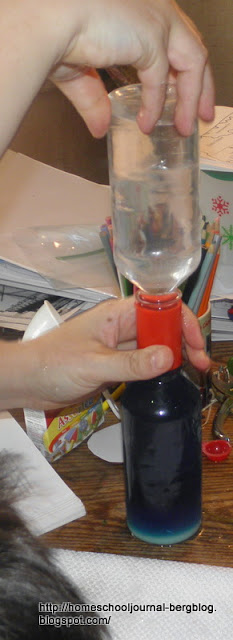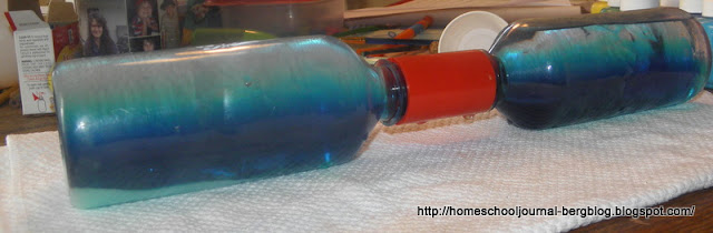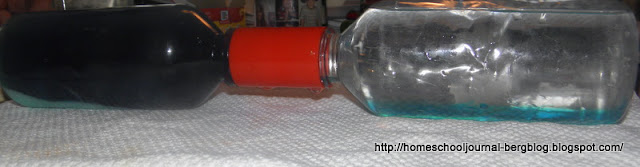 If you continue to watch the bottles for at least 5 minutes, you will see that the bottles pretty evenly divide, with the colored water on the bottom and the clear water on the top.