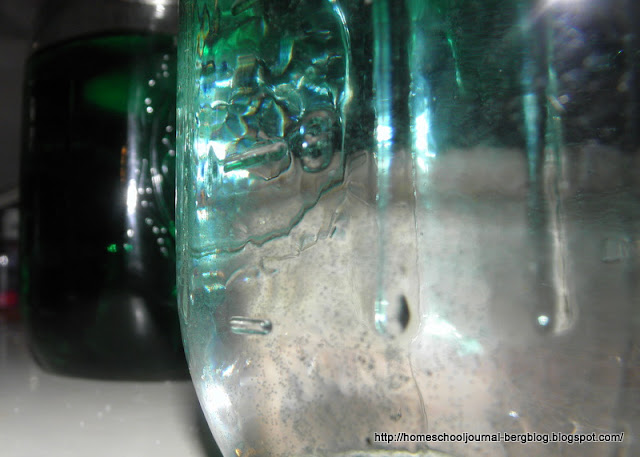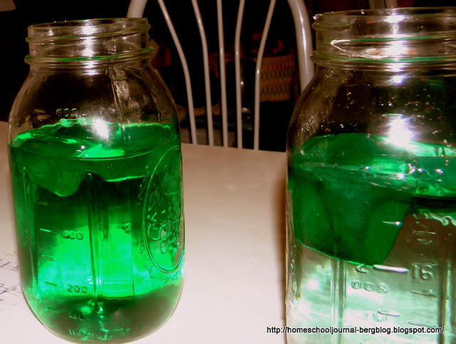 | The two jars react very differently when the colored ice cubes are added to them. |