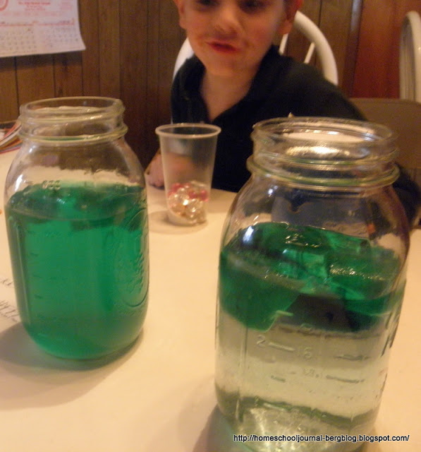 In the other jar the ice melted more slowly and the food coloring formed a layer at the surface. Because the ice cubes were made of fresh water, as they melted, the water floated at the top of the denser salt water.