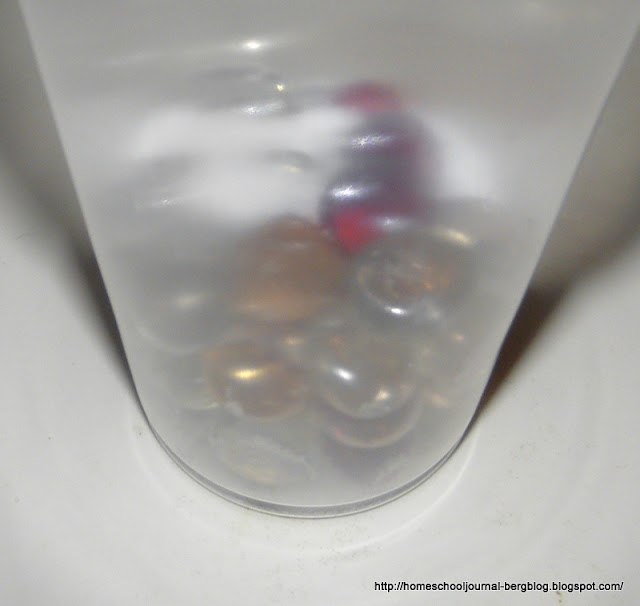 To demonstrate for the little boys how the salt-water could be more dense than fresh water, I took a cup with some marbles in it and told them that this is just like the water molecules and then added some salt to the cup. This is like the salt molecules, which are able to fit in between the water molecules, making the entire substance more dense.