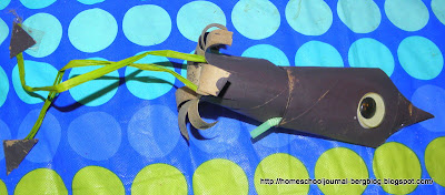 Take two pieces of yarn, string or raffia (which is what we used) and attach the two triangles left over from the trim of the top of the tube earlier.