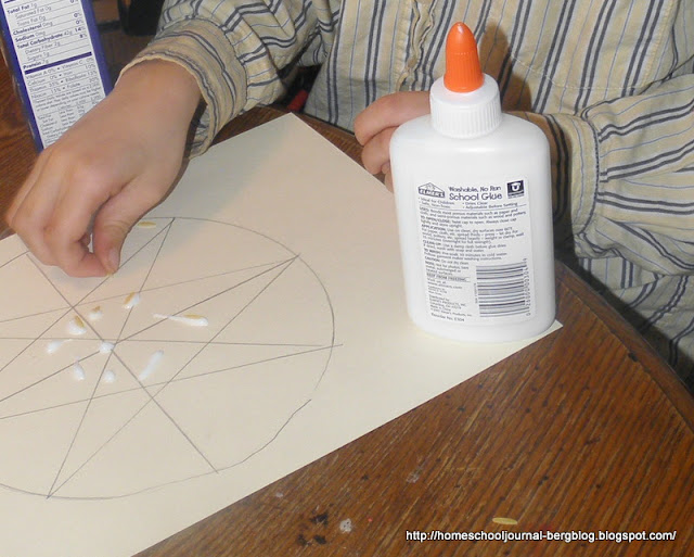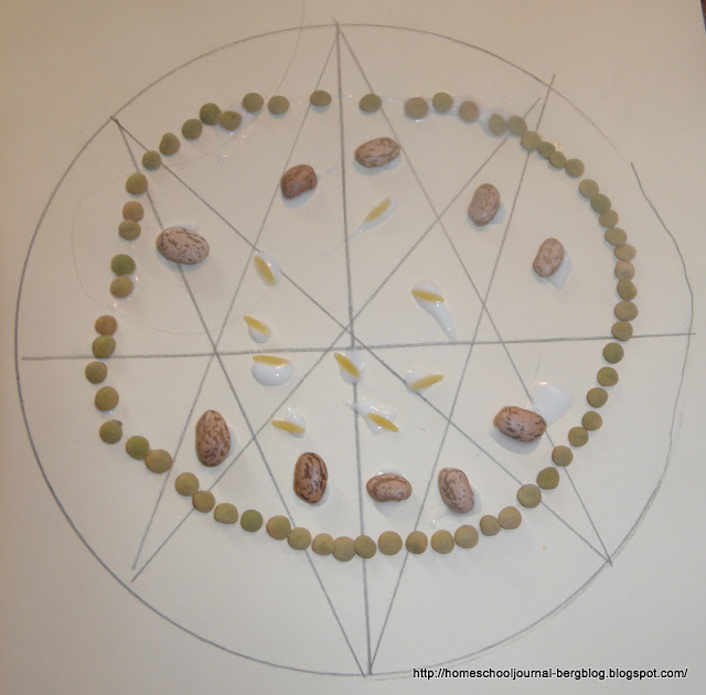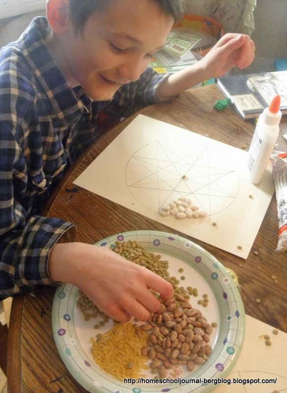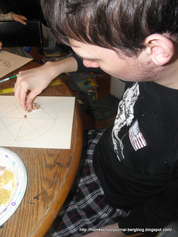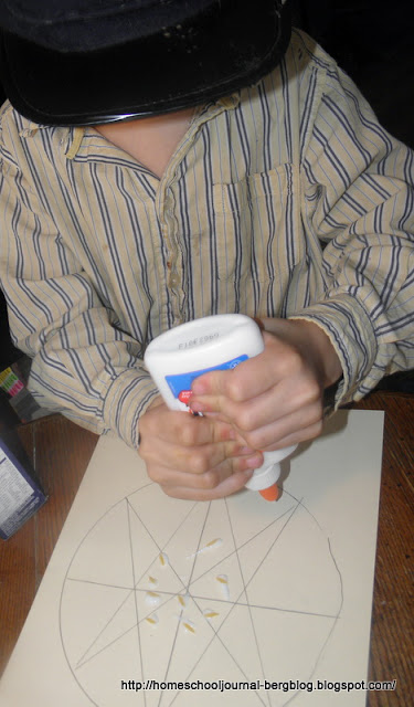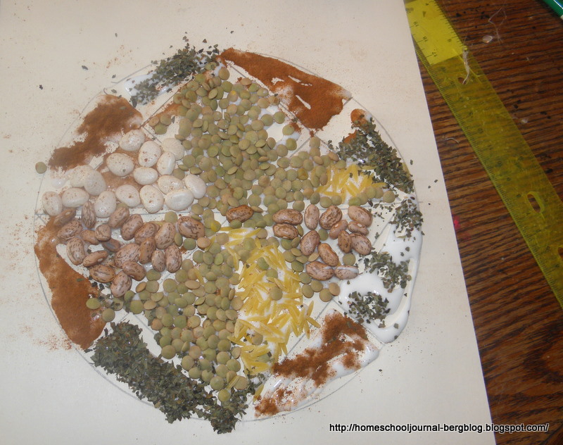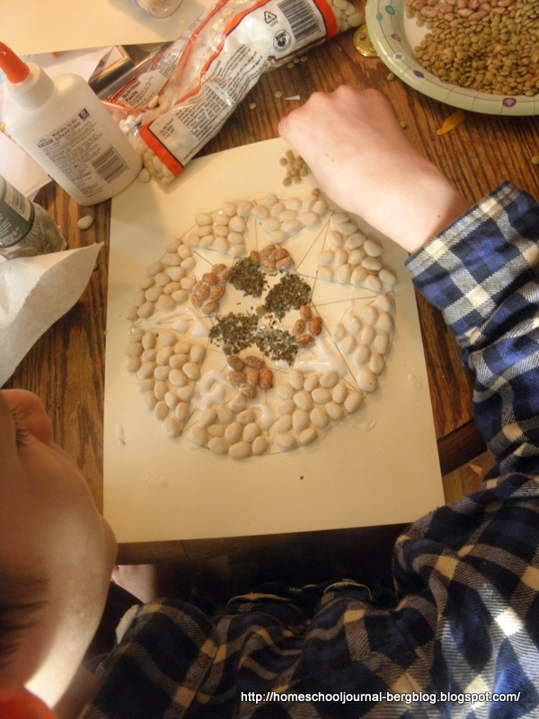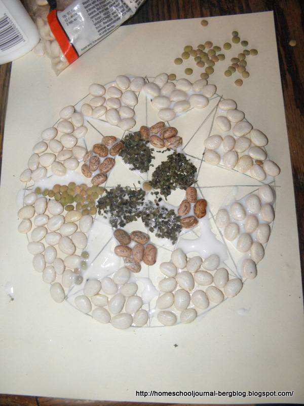| They then glued beans, lentils, pasta and spices on their patterns. |