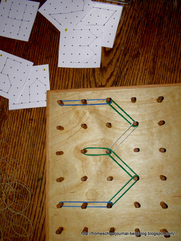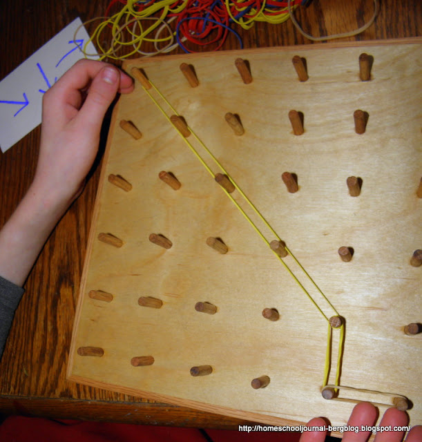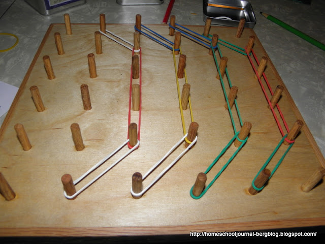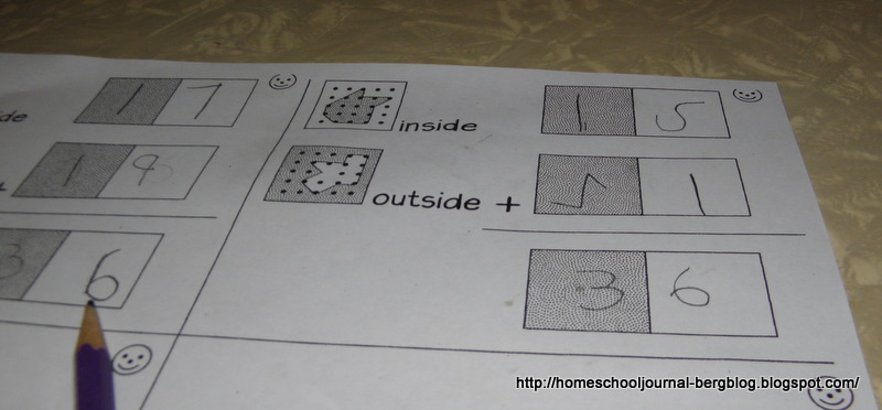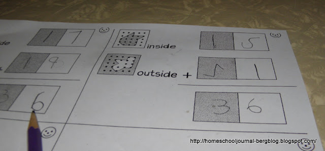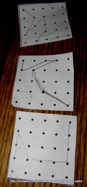 and made our graph 3 boxes by 2 boxes and wrote the numerals around the top and right hand edges. We then copied what the first (1) and second (2) boxes of the bones had in them. We then added the numerals on a diagonal, getting the correct answer; 1,476.You have to use a slightly different method of adding up the numbers if you get numbers that have carrying in them. For this problem, for example, 123 x 67, you will get the numerals from left to right, 7 1,14,11 and 7. If you get numerals over 9, you must carry them over into column addition. You write down the numeral(s) and then add the number of 0's after it that corresponds to the number of columns after it. Since 1 is in the first row, it gets no 0's after it. 14 is in the next row, and it has only 1 row after it, so you write down 14 with 1 0 behind it, or 140. The next row has 11 in it (pardon the odd looking numerals; my son made a mistake in his addition the first time and got 10, but then changed it to an 11) so you write 11 with two 0's behind it for the two columns, or 1100. The last row has a 7 in it and it has three 0's behind it for the three rows, or 7000. Add these numbers together and you will get 8,241; the correct answer. This is something that is complicated to explain but easy to use once you understand how it goes. All a child needs to be able to do is add two digit numbers.
